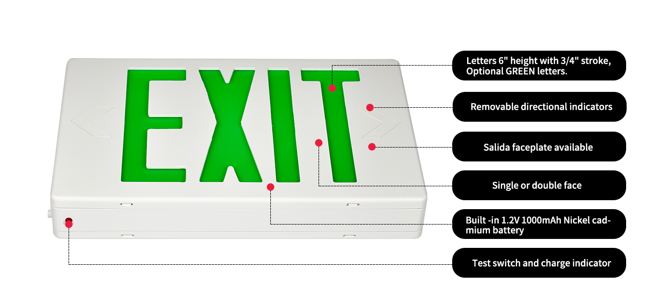 ป้ายทางออกที่เรียบง่ายมีประสิทธิภาพและปลอดภัยพร้อมตัวอักษร LED สีเขียว 6 นิ้วหน่วยนี้ต้องใช้การดำเนินการ 120 หรือ 277 VAC