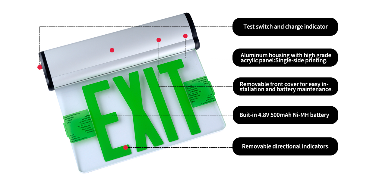 *Illumination - Series Exit Exit Sign นี้ให้แสงสว่าง LED LIT LED เครื่องถูกสร้างขึ้นด้วยบอร์ด LED เอาต์พุตสูงสีเขียว  การใช้พลังงานได้รับการจัดอันดับที่น้อยกว่า 3 วัตต์สำหรับหน่วยรุ่น AC เท่านั้น หน่วยสำรองแบตเตอรี่การใช้พลังงานได้รับการจัดอันดับที่น้อยกว่า 1 วัตต์