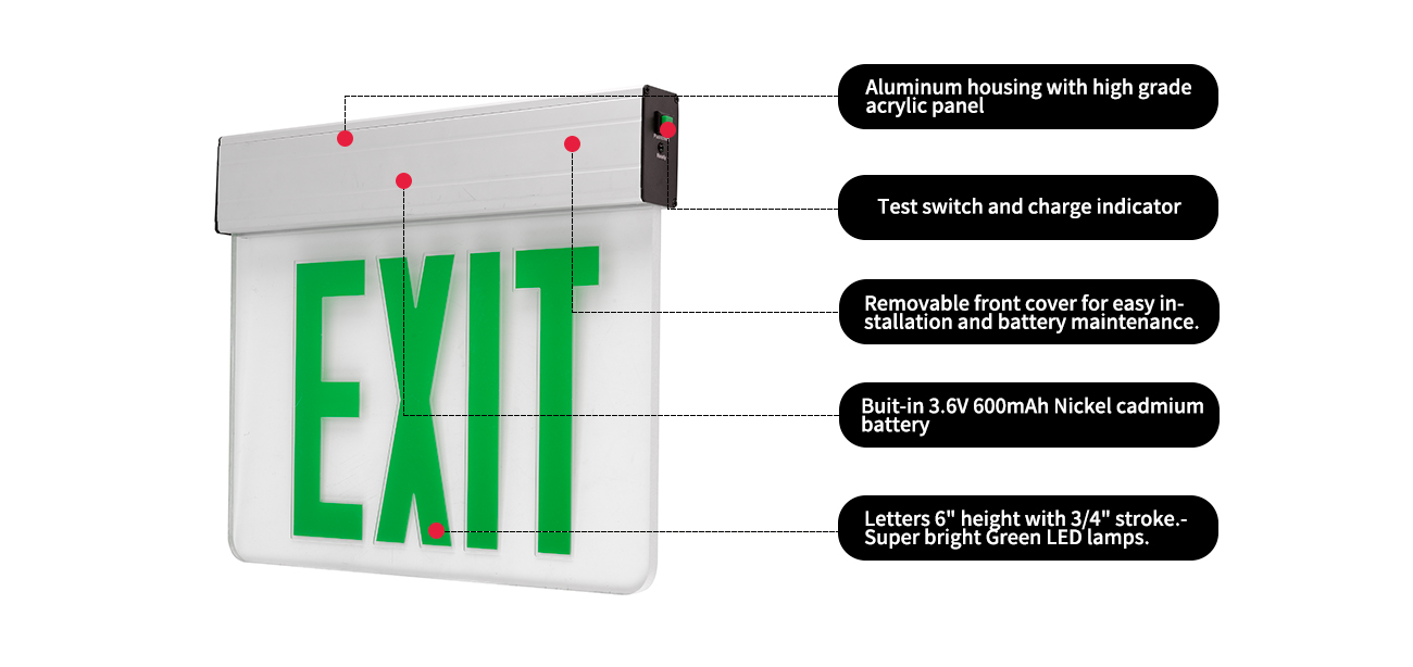 *Illumination - Series Exit Exit Sign นี้ให้แสงสว่าง LED LIT LED เครื่องถูกสร้างขึ้นด้วยบอร์ด LED เอาต์พุตสูงสีเขียว  การใช้พลังงานได้รับการจัดอันดับที่น้อยกว่า 3.5 วัตต์สำหรับหน่วยรุ่น AC เท่านั้น หน่วยสำรองแบตเตอรี่การใช้พลังงานได้รับการจัดอันดับที่น้อยกว่า 1 วัตต์