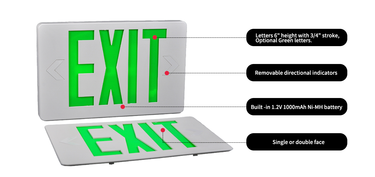 ลูกศรซ้ายและขวาสามารถเคาะออกจากแผ่นหน้าเพื่อชี้ไปที่ทิศทางการออก ตัวยึดการติดตั้งสากลช่วยให้ง่ายต่อการติดตั้งจากด้านบนหรือด้านข้าง เครื่องหมายทางออกนี้ประกอบไปด้วยการประกอบล่วงหน้าและจัดส่งด้านเดียวพร้อมแผ่นปิดหน้าเพิ่มเติมที่รวมอยู่ในกล่องสำหรับการประกอบแบบแมนนวลเสริม